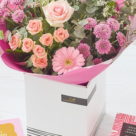 A pastel handmade Mother's Day bouquet, plus a selection of scrumptious chocolates and a full-sized card.