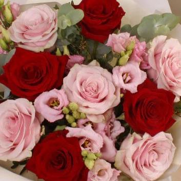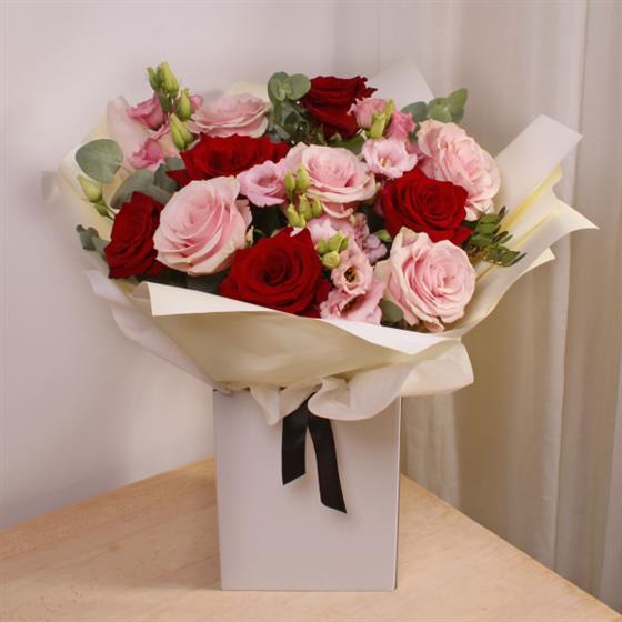 A striking blend of large red roses, soft pink roses and delicate pink lisianthus, beautifully balanced with eucalyptus and pistache greenery for a fresh, elegant finish.